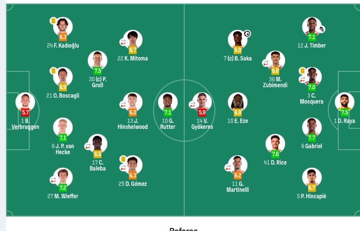 布莱顿首发:1-维尔布鲁根、6-范赫克、21-博斯卡利、24-卡迪奥卢、13-辛谢尔伍德(68’18-维尔贝克)、17-巴莱巴(78’26-阿亚里)、25-迭戈·戈麦斯(79’53-霍维尔)、27-韦弗(78’34-维尔特曼)、30-格罗斯、10-鲁特尔、22-三笘薰(46’11-明特)。