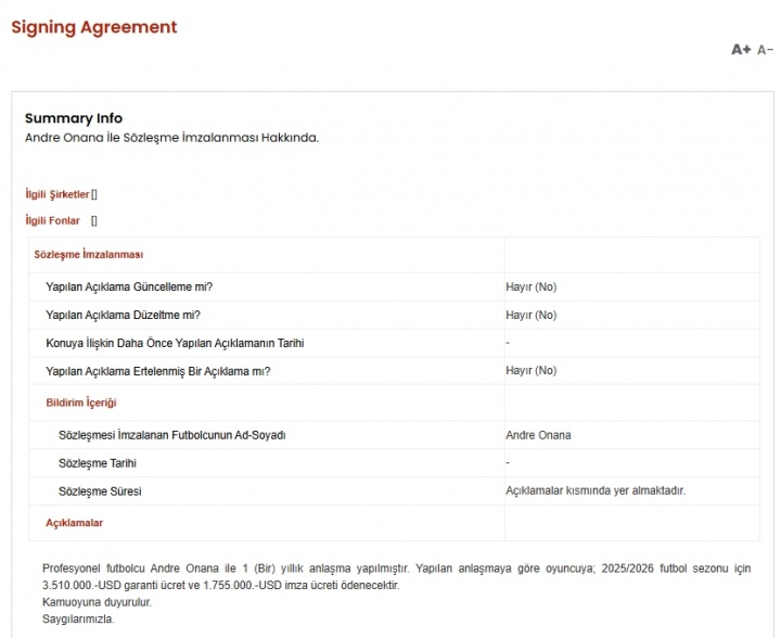 官方:奥纳纳租借土超的年薪351万美元,签字费175.5万美元 频道:西甲 日期:2026-01-17 13:37:11 浏览:44 09月12日讯 特拉布宗体育官方宣布,曼联门将奥纳纳租借加盟。据土耳其资本市场委员会(KAP)发布的重大事件披露显示,奥纳纳租借期限为一年,球员基础薪资351万美元,签字费175.5万美元。 上一篇:开云体育app-第一次遭遇,U23国足将在U23亚洲杯上首次与泰国U23交手 下一篇:开云官方网站-【欧国联】B费破门C罗绝杀 葡萄牙2比1苏格兰 相关文章 KAIYUN SPORTS-比克斯塔夫:我们对杜兰特束手无策 火箭频频命中&我们打不出反击 开云体育app-【夜读】金球奖结果被泄露 本泽马夺魁马内获得第二 kaiyun开云-近13场比赛未出场,Shams:库明加已经要求勇士将自己交易 kaiyun开云-【早报】无伤曼城开启收割模式? 开云官方网站-今夏自由市场最大牌中锋?哈滕有望争取亿元合同 开云官方网站-【欧国联】B费破门C罗绝杀 葡萄牙2比1苏格兰 官方:奥纳纳租借土超的年薪351万美元,签字费175.5万美元 开云体育app-第一次遭遇,U23国足将在U23亚洲杯上首次与泰国U23交手